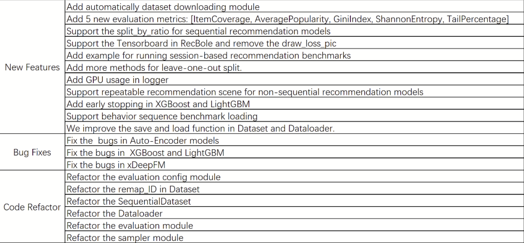 | Evaluation | 全排序评测和采样评测流程独立,用户无法添加客制化指标,评测加速逻辑存在局限性。 | 统一了全排序评测和采样评测流程,支持用户客制化的指标开发并添加了non-accuracy的评测指标,优化了加速逻辑。 |