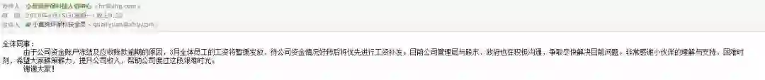小黄狗在内部邮件中解释称,“受‘团货网’事件的影响,导致公司账户被政府冻结,公司缺少流动资金,无法正常运营,也无法按时发放工资、缴纳社保和住房公积金,后续业务发展方向尚不明朗。”对于员工薪资发放安排,发放日期不确定。