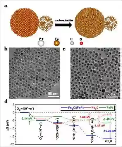 图1. a)合成示意图;b)PtFe-Fe3O4纳米粒子;c)PtFe-Fe2C纳米粒子;d)DFT计算