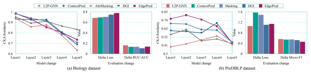 如图 2 所示,微调前后 L2P-GNN 参数的 CKA 相似性通常小于基线,这表明 L2P-GNN 经历了更大的变化,从而更加适应下游任务。