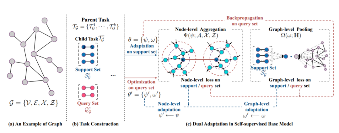 该研究首先提出了一个自监督 GNN 模型,在模型无关元学习(MAML)设置中学习图结构,然后是节点和图级双重适应,以模拟预训练过程中的微调。