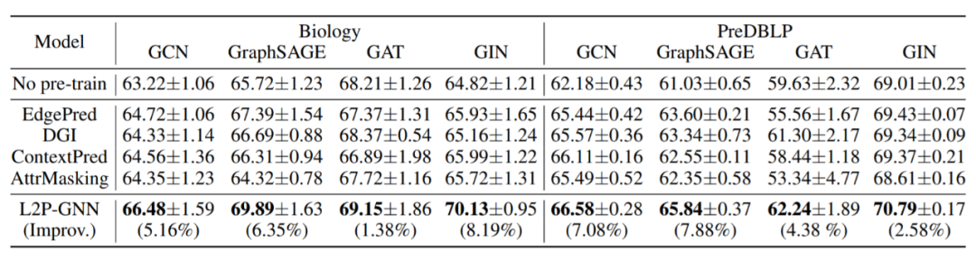 表 2 对比了 L2P-GNN 和 SOTA 预训练基线(4 种不同的 GNN 架构)的性能,得到了以下发现: