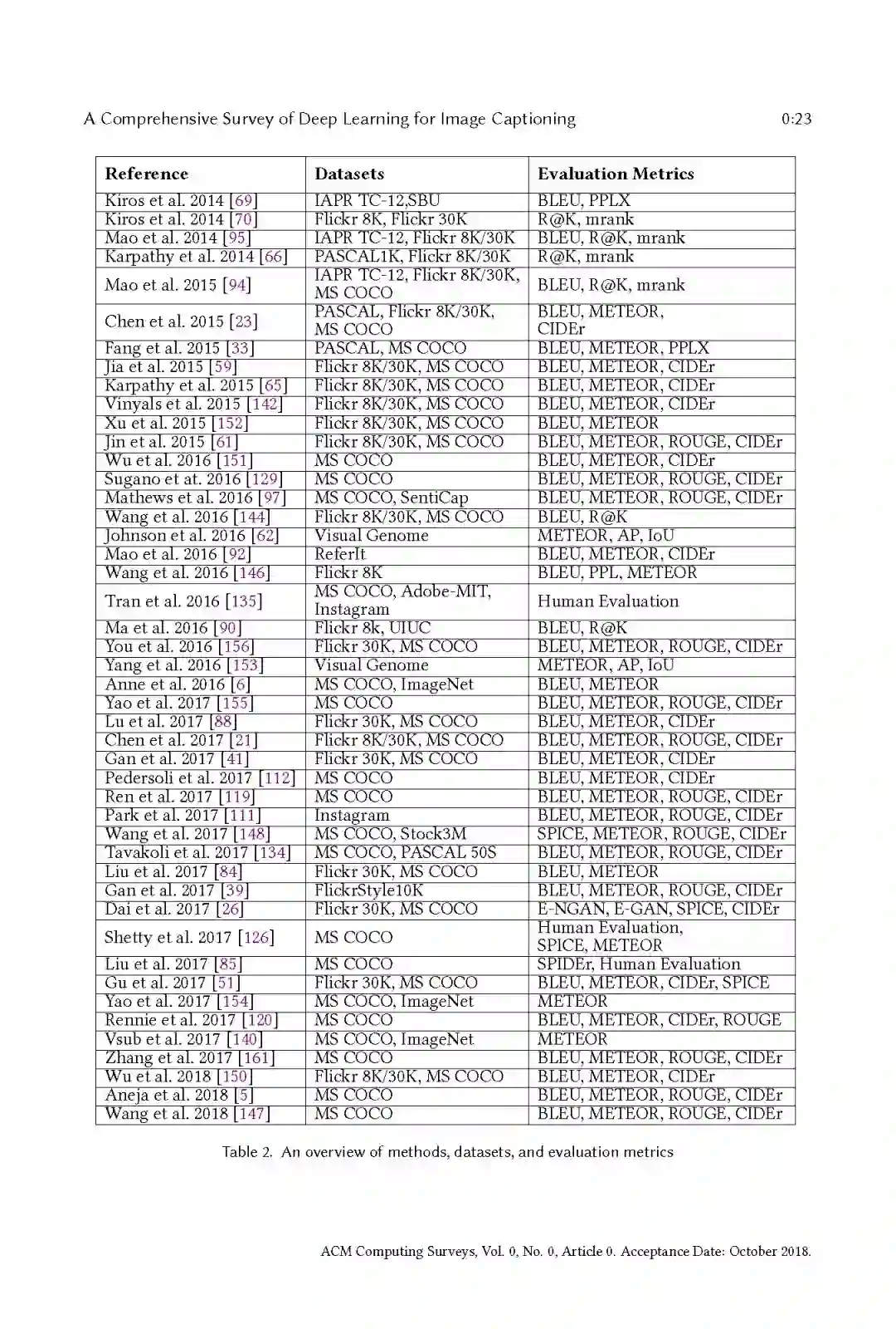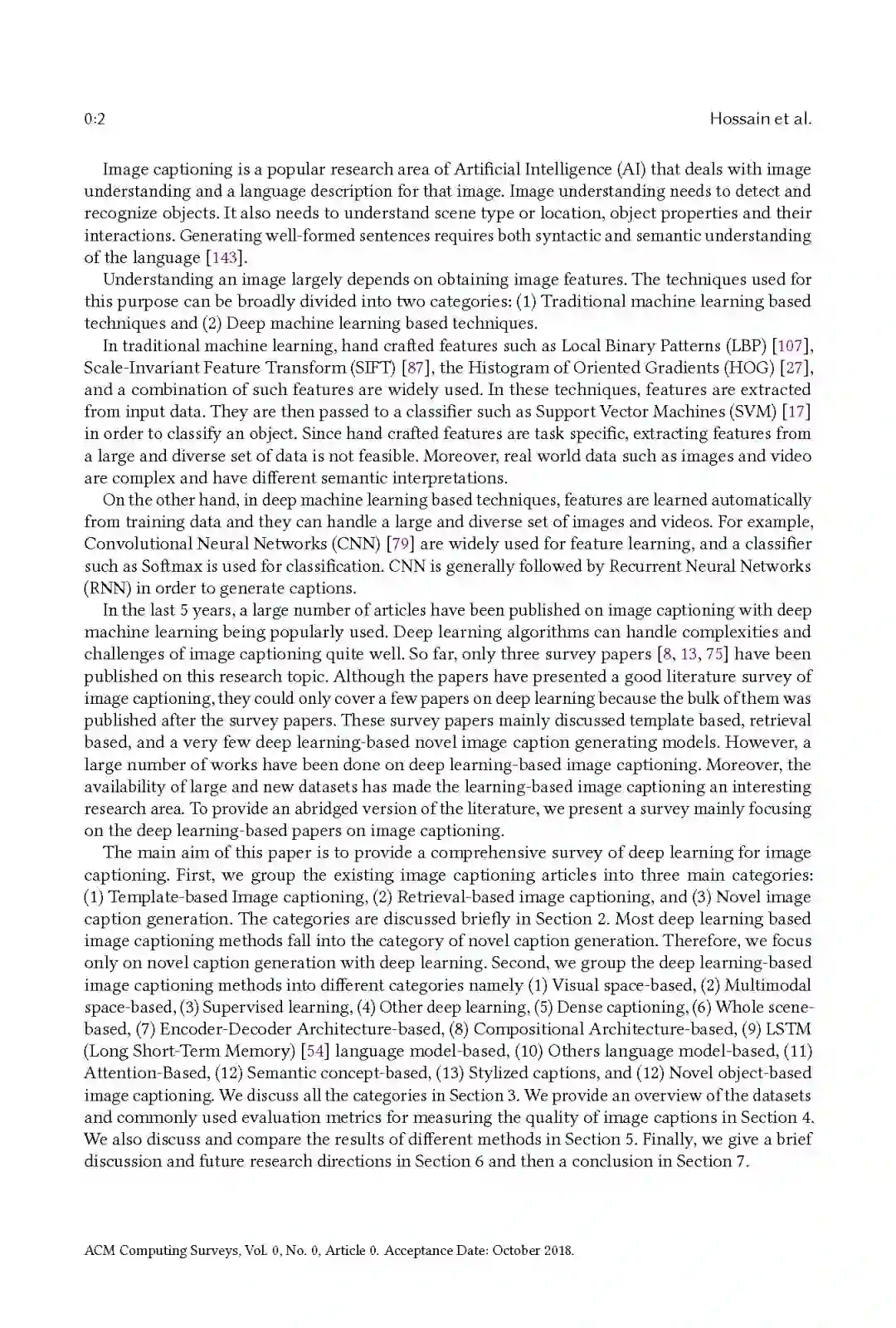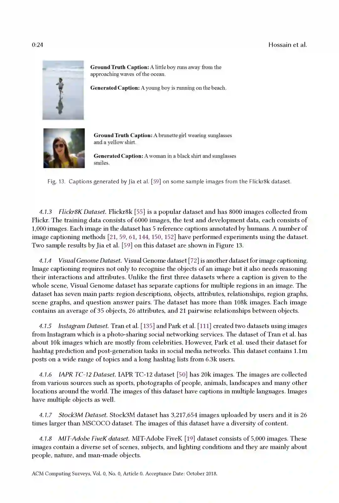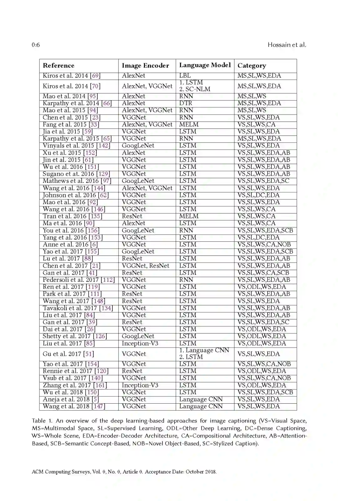 近5年来,大量关于深度学习图像描述生成的文章被广泛使用。深度学习算法能够很好地处理图像描述生成的复杂性和一系列挑战。到目前为止,只有三篇关于这个方向的综述论文(8,13,75,见论文)发表。虽然这些论文对图像描述生成进行了很好的文献综述,但由于大部分论文只覆盖少量关于深度学习的论文。这些综述论文主要讨论了基于模板、基于检索、基于深度学习的图像描述生成模型。然而,在基于深度学习的图像描述生成方面,研究者们已经做了大量的工作,并且还有好多新数据集的使用,当前暂时还没有一个全面的图像描述生成的综述。