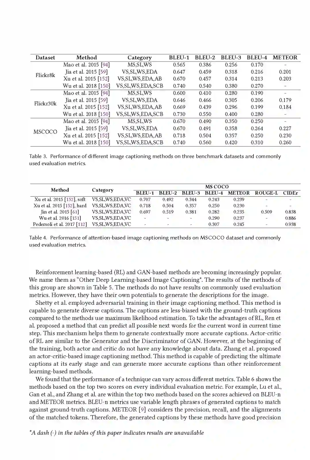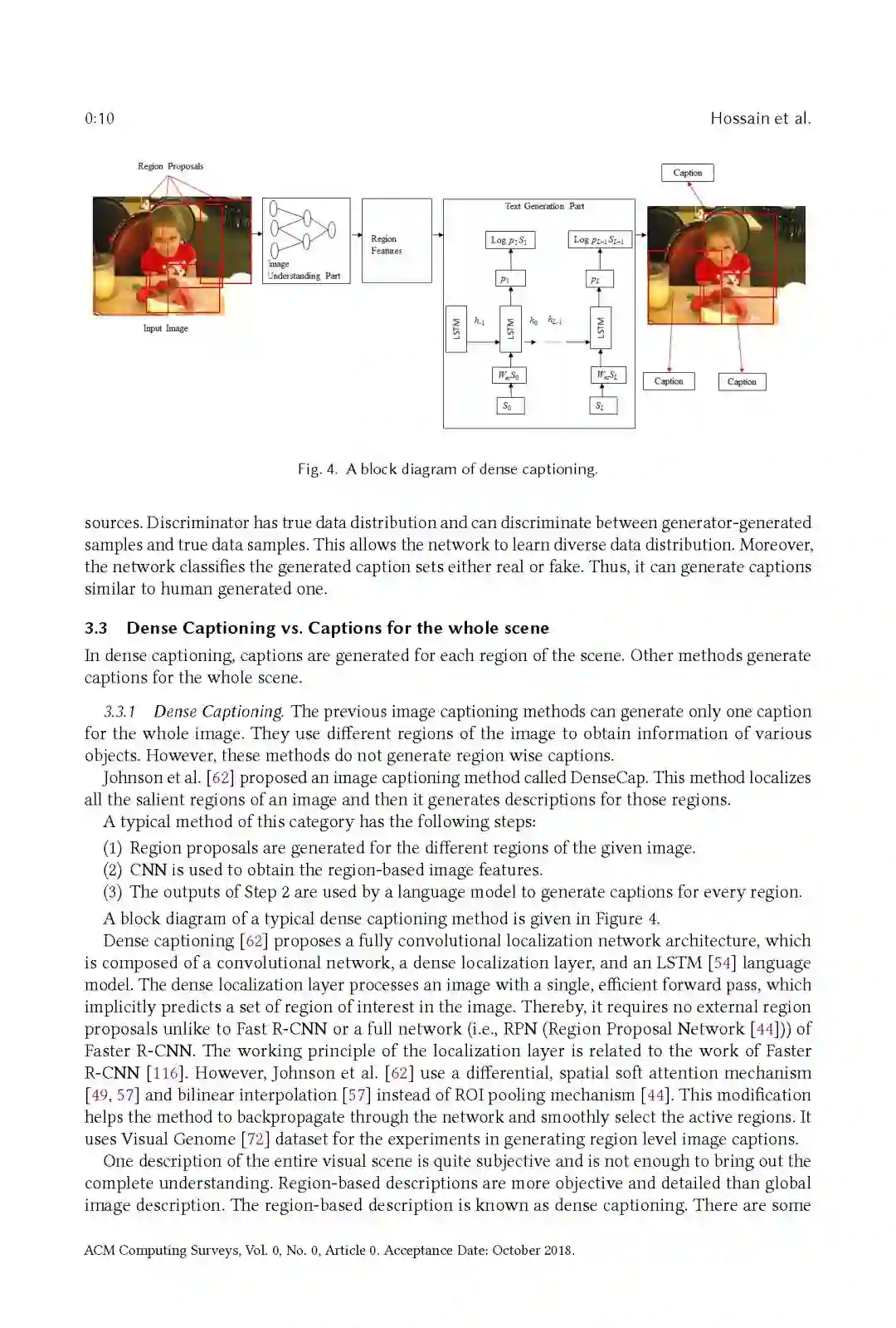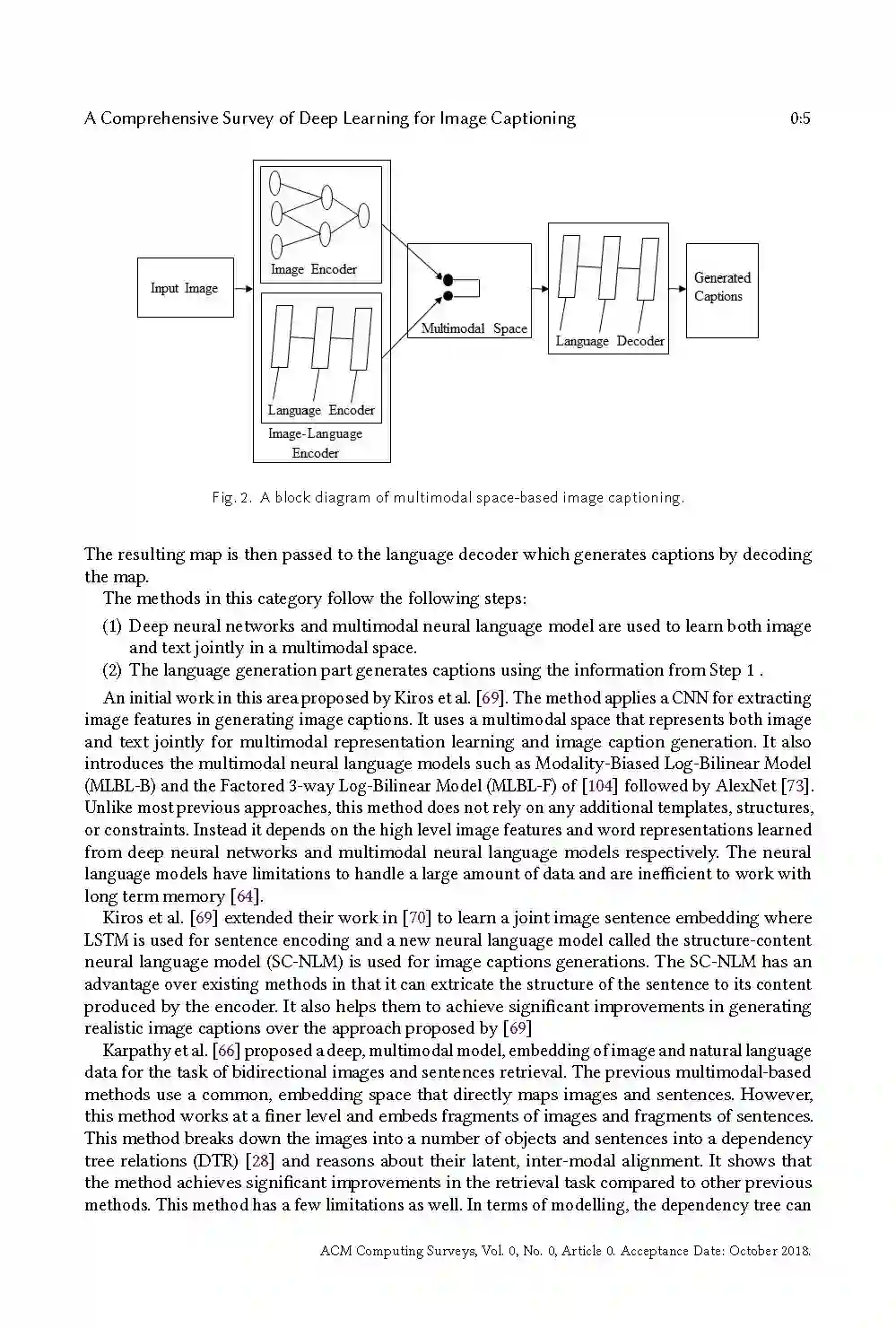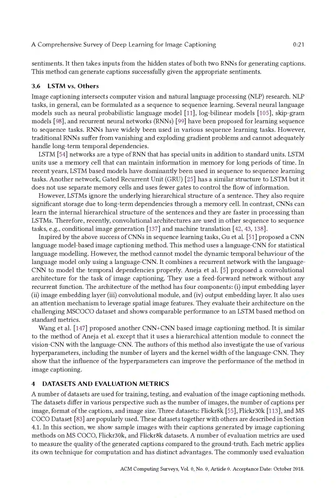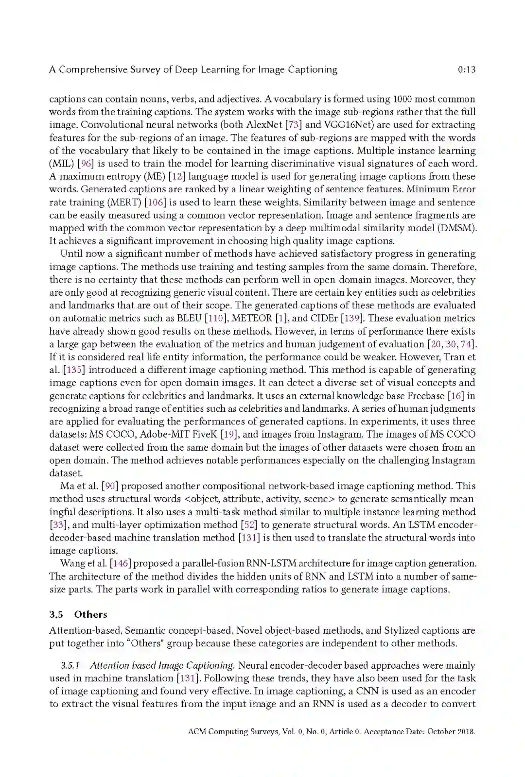 近5年来,大量关于深度学习图像描述生成的文章被广泛使用。深度学习算法能够很好地处理图像描述生成的复杂性和一系列挑战。到目前为止,只有三篇关于这个方向的综述论文(8,13,75,见论文)发表。虽然这些论文对图像描述生成进行了很好的文献综述,但由于大部分论文只覆盖少量关于深度学习的论文。这些综述论文主要讨论了基于模板、基于检索、基于深度学习的图像描述生成模型。然而,在基于深度学习的图像描述生成方面,研究者们已经做了大量的工作,并且还有好多新数据集的使用,当前暂时还没有一个全面的图像描述生成的综述。