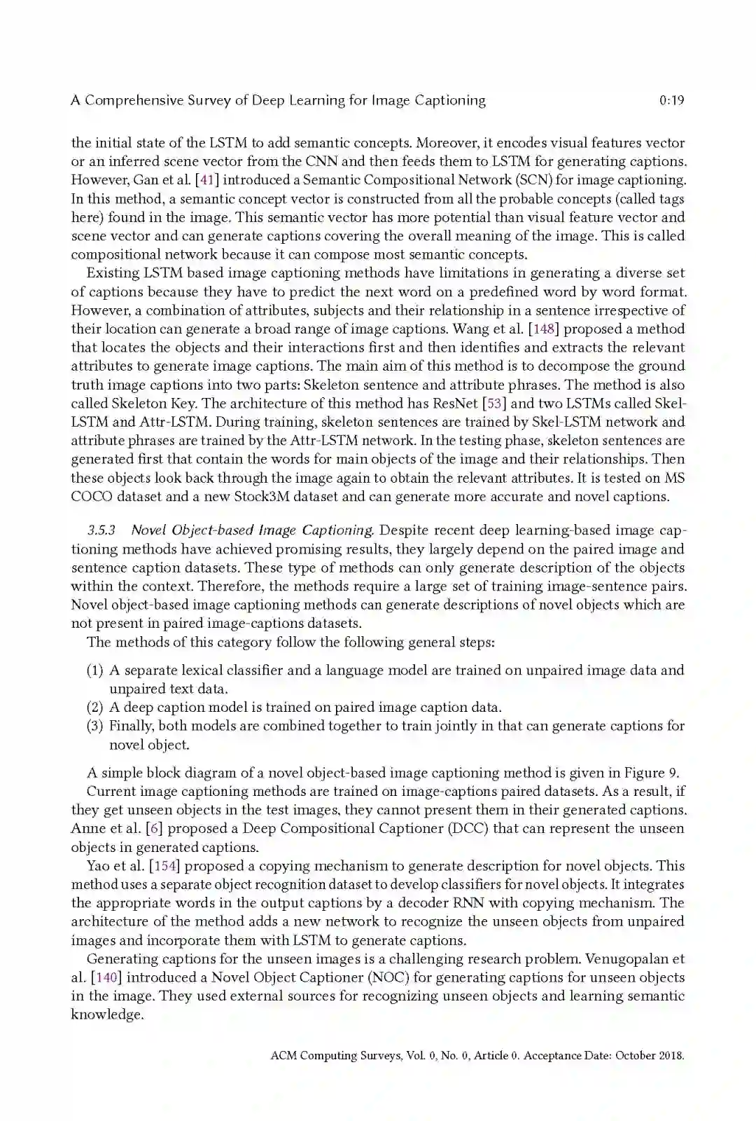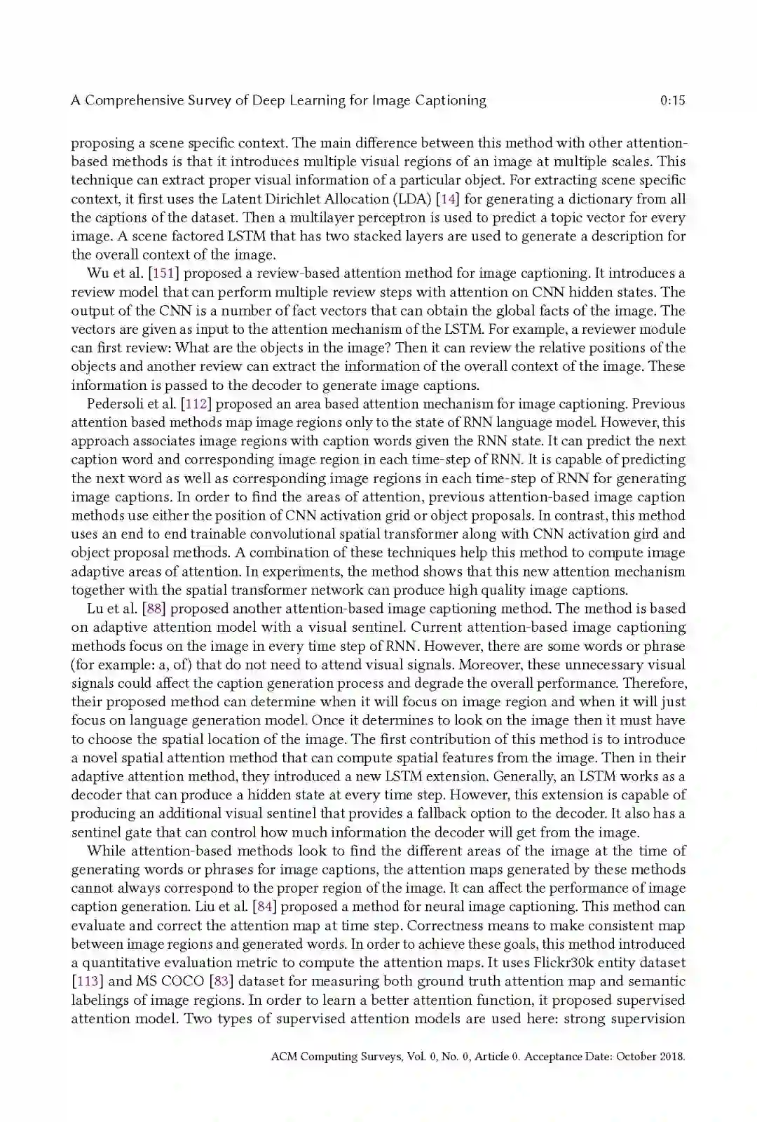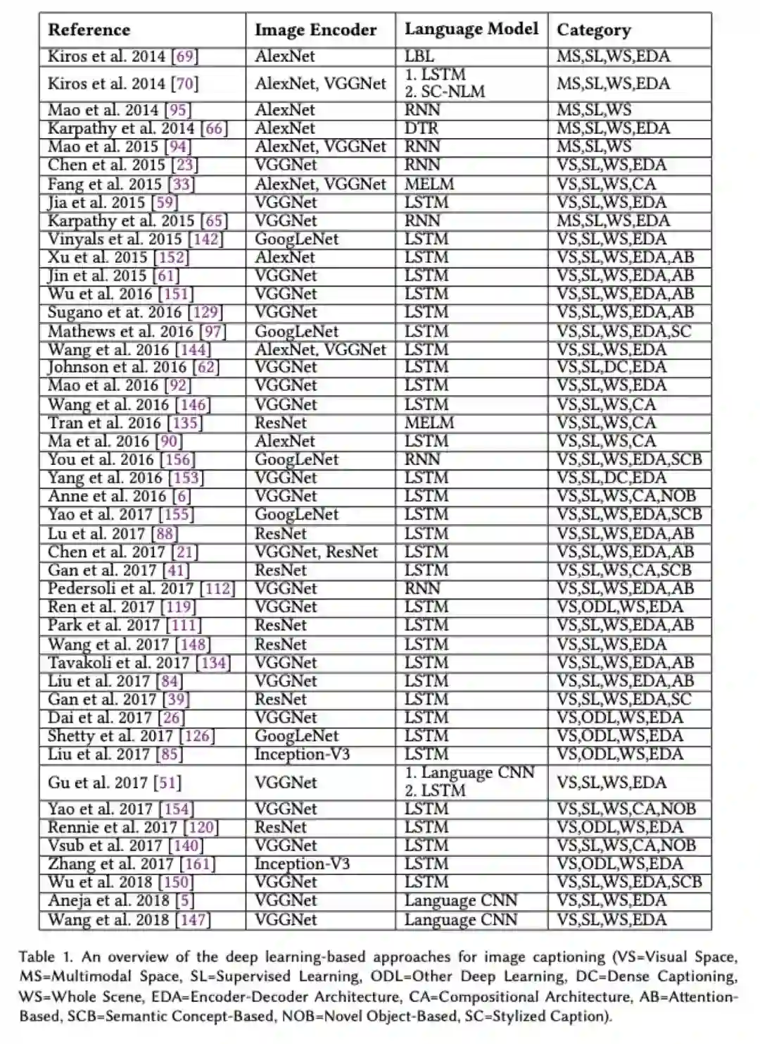 其次, 论文将基于深度学习的图像描述生成方法分为不同的类别,即1)基于视觉空间,(2)基于多模态,(3)监督学习,(4)其他深度学习,(5) Dense captioning, (6)基于整个场景, (7)基于Encoder-Decoder体系结构, (8)基于组合体系结构, (9)基于LSTM(长短期记忆的语言模型, (10)基于其他语言模型, (11)基于注意力,(12)基于语义概念,(13)Stylized captions等等。