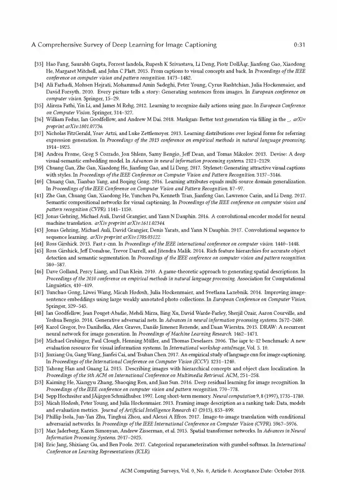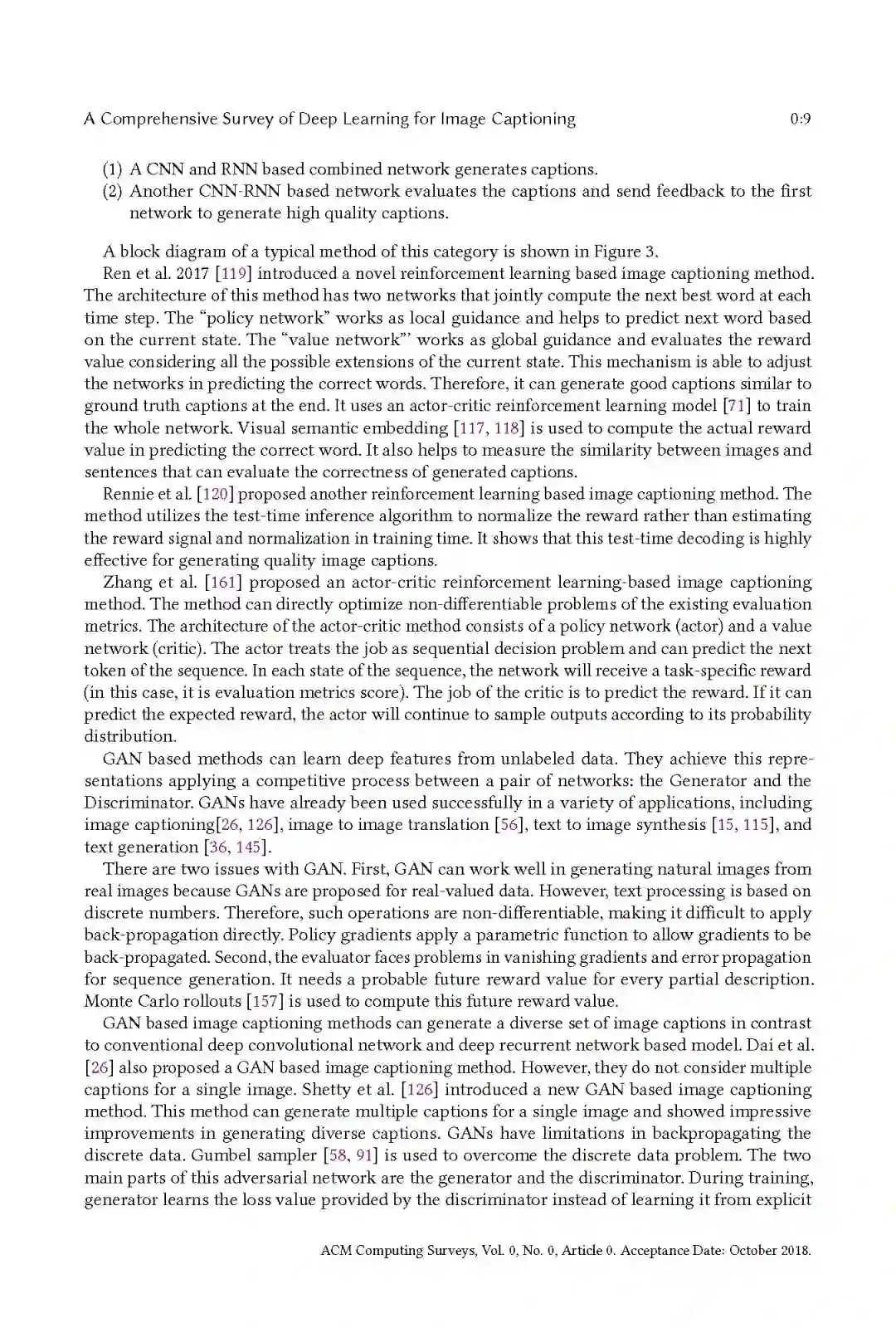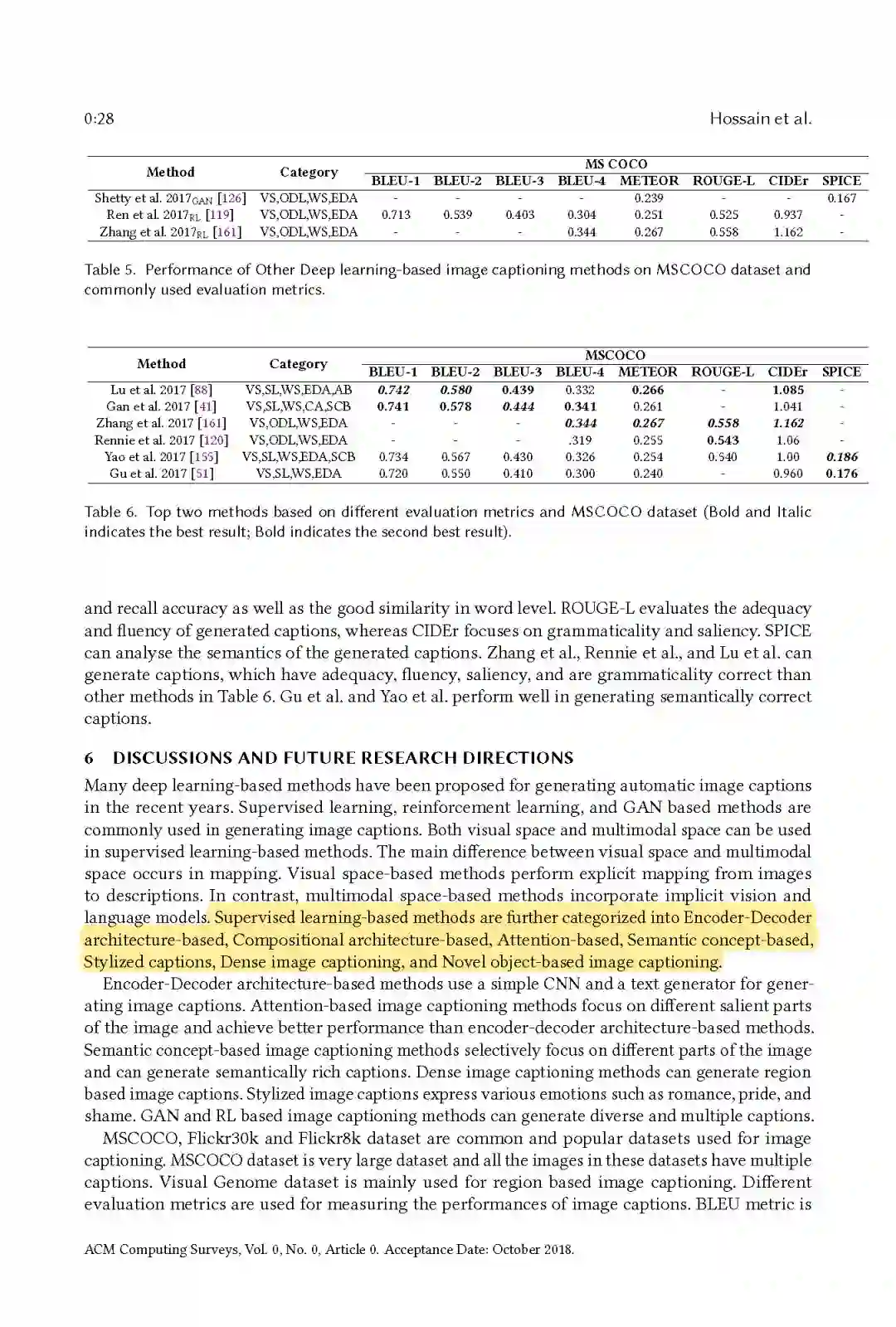 其次, 论文将基于深度学习的图像描述生成方法分为不同的类别,即1)基于视觉空间,(2)基于多模态,(3)监督学习,(4)其他深度学习,(5) Dense captioning, (6)基于整个场景, (7)基于Encoder-Decoder体系结构, (8)基于组合体系结构, (9)基于LSTM(长短期记忆的语言模型, (10)基于其他语言模型, (11)基于注意力,(12)基于语义概念,(13)Stylized captions等等。