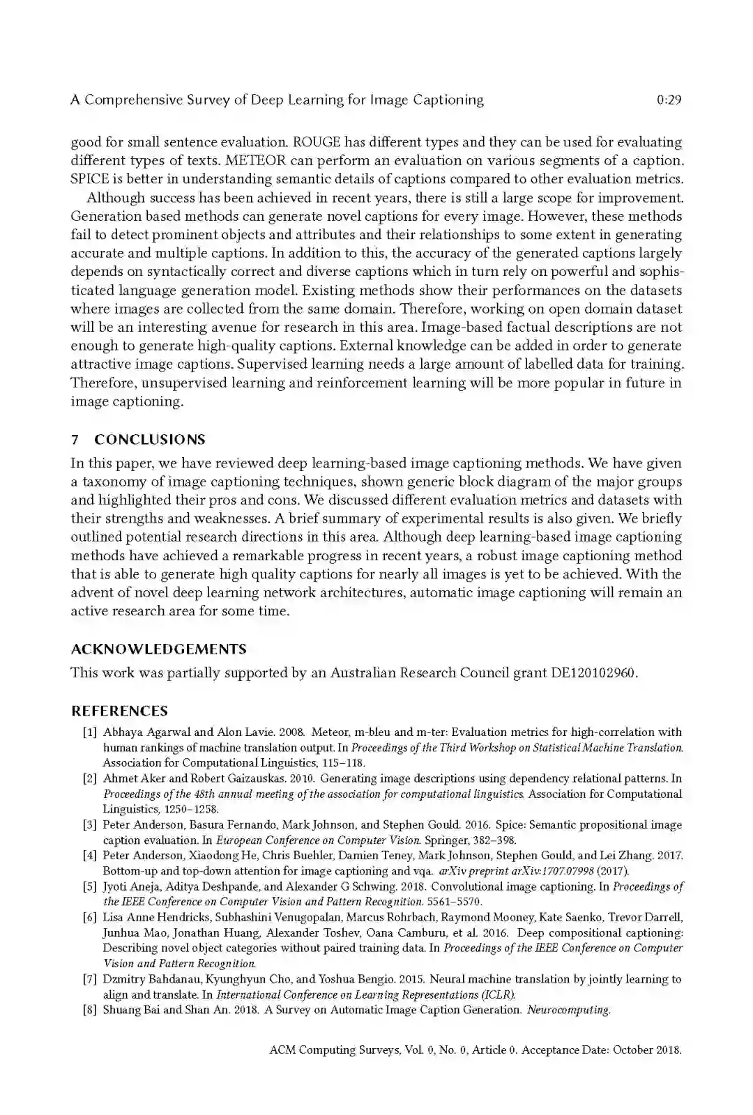论文在第3节中讨论上述所有的类别,在第4节中提供了数据集的概述和用于评测图像描述生成的常用评估指标,还在第5节中讨论并比较了不同方法的结果。最后,我们在第6节简要讨论了未来的研究方向,并在第7节进行了总结。