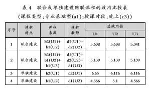 研究发现,当院校联合建设网联课程时,将影响各个学校学生选课的总效用值趋于平衡。表4给出了合作或单独建设网联课程的效用比较情况,其中,U1表示某“一本院校”,U2、U3表示某两所“二本院校”,b2(U1)表示U1学校的课程来源属性是b2水平(一本),d1(U1)表示U1学校的课程教师属性是d1水平(副教授),其余依此类推。为方便计算,“+”表示以课时均分的合作授课形式,在计算总效用值时采用相同加权作用于五个属性。