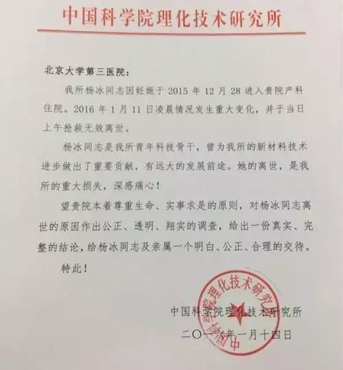 不仅如此,杨冰丈夫还搬来了老婆生前的单位—中科院理化所,出具了一份霸气十足的红头公函。由于中科院这种级别单位的卷入,以及北医三院正面硬刚毫不妥协的态度,使事件不断升级,被部分媒体冠以“顶级医闹”。