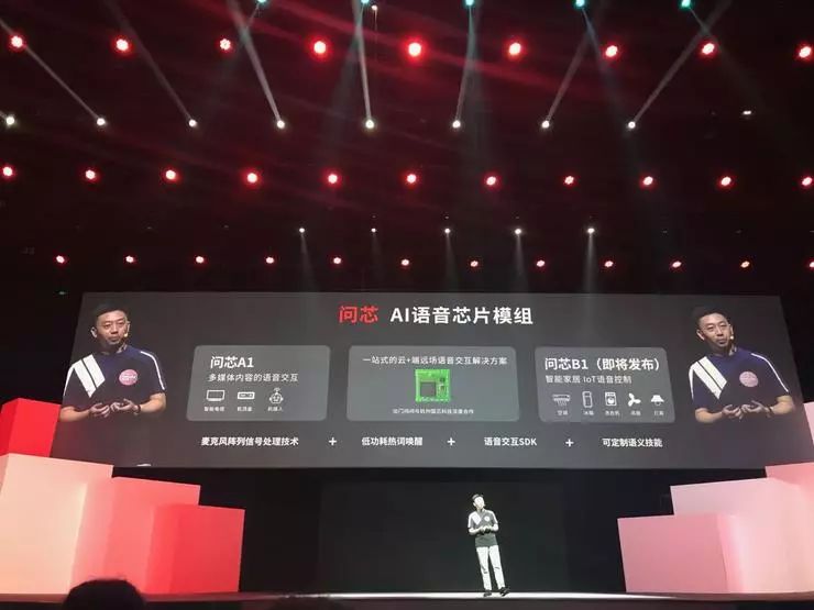 上游侧,发布问芯,是AI语音的芯片模组。解决了现在的智能电视不能远场唤醒的问题。芯片跟杭州国芯一起合作,但是把麦克风技术、信号处理技术,包括低功耗的唤醒技术都做到了芯片模组里面。用一个usb线跟芯片模组连接,电视即成为一个可以远程语音交互的智能电视。