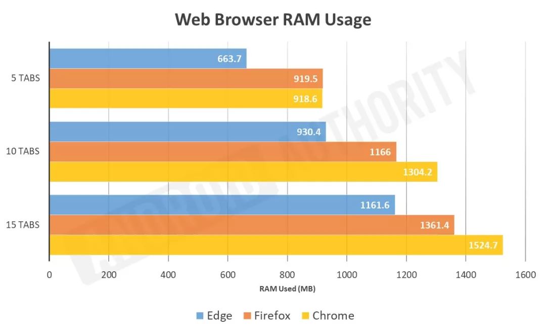 而如今,Robert Triggs 直言,微软的 Edge 将会比 Firefox 更轻巧。为了验证这一点,Robert Triggs 进行了一项快速测试,其在每个浏览器上打开了多达 15 个标签页(每个浏览器打开的是相同的标签),他在所有页面加载完成之后开始测试 RAM 的使用情况。