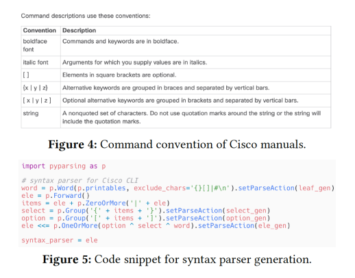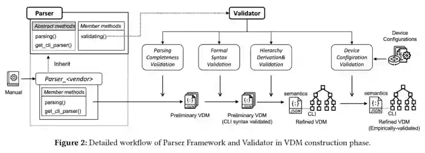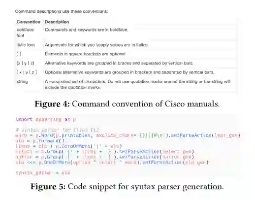 。研究者基于对一些主流设备厂商手册的深入调研分析,洞察到尽管多设备商配置手册制式不一,但配置手册的基础功能 “向用户展示如何配置设备” 是不变的。因此,手册通常需要描述设备所支持的所有配置命令及其功能、配置参数及其含义描述、配置命令的工作视图和配置样例。基于这一洞察,研究者设计了一种设备商无关的统一格式,用于归一化不同设备商配置手册的制式差异,同时平衡了可扩展性和可读性。研究者进一步设计了测试驱动的流程,保障为主流设备商定制解析器的过程更为高效和可靠。