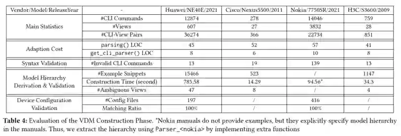 在第一阶段的评估中,研究者展示了基于四个主流设备商(华为、思科、诺基亚 / 阿朗、华三)的配置手册,使用 NAssim 解析器 + 校验器构建设备原生配置模型的实践经验。实验详细结果如下表 4.