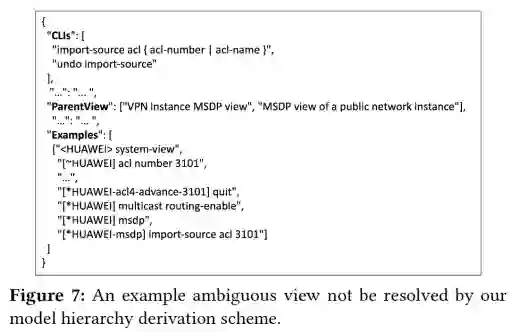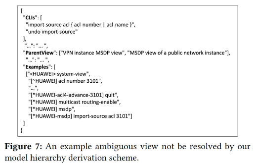 由于配置手册中存在的歧义性错误,上述配置命令层级结构推理算法有时无法完全保证构建出完整层级结构。如下图 7 所示,两个工作视图共享一个配置样例,因此无法完全确定 msdp 命令是进入第一个视图的父命令、或是进入第二个视图或者两者皆可。因此,研究者进一步设计了针对每个层级视图的推理的可靠性的衡量步骤,并记录可能存在歧义的推理,交由运维工程师进行针对性审阅。