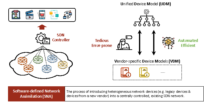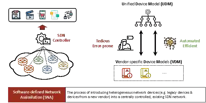 。SNA(Software-defined Network Assimilation,软件定义网络同化)是指将异构的设备配置模型(包括传统设备和新引入的设备商设备)接纳入现有的集中式控制的网络中的过程,其核心难题是解决多样的设备原生配置模型(Vendor-specific Device Model,VDM)和中心控制器统一配置管理模型(Unified Device Model,UDM)的映射问题。