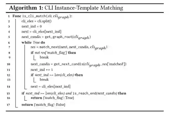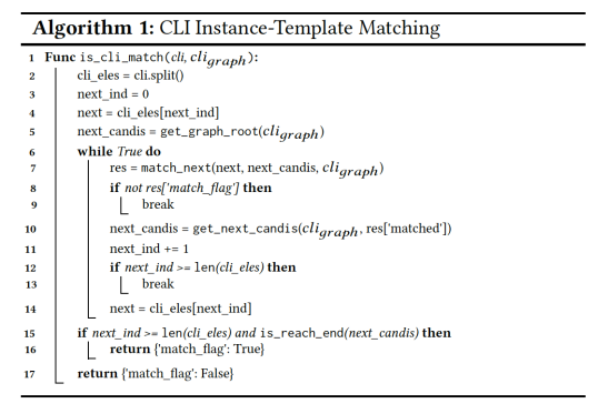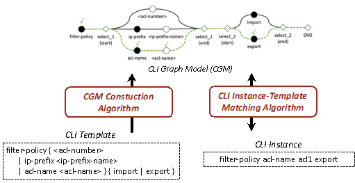 要实现配置命令层级关系的推导,需要一个基础算法能力:确定一个配置实例是否和一个配置命令模版匹配。因此研究者分别设计了 “配置命令图模型构造算法” 和“基于配置命令图模型的配置实例 - 模版匹配算法”(如下图),高效支撑基于配置样例的配置命令层级结构的推理算法。