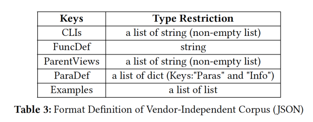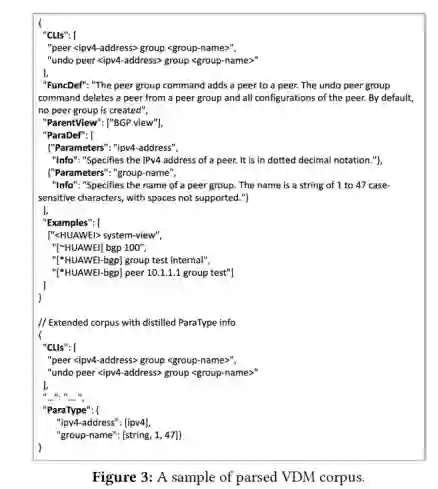 。基于对主流设备厂商手册的深入调研分析, NAssim 设计了基于 JSON 的格式(如下表 3 所示)来承载核心的配置信息:设备所支持的所有配置命令及其功能、配置命令的工作视图、配置参数及其含义描述和配置样例。下图 3 展示该解析器框架生成的一个配置语料样本。
