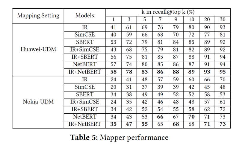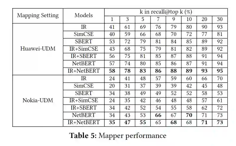 实验结果表明,经过配置领域适应的 NetBERT 模型结合 IR 粗筛达到了最佳的配置映射推荐效果。在映射华为设备的配置模型到控制器统一配置模型的实验中,recall@top 10 为 89%,这意味着如果允许推荐 10 个映射,则只有 11% 的情况下,运维工程师需要去翻阅配置手册,提升了 9 倍运维工程师效率。