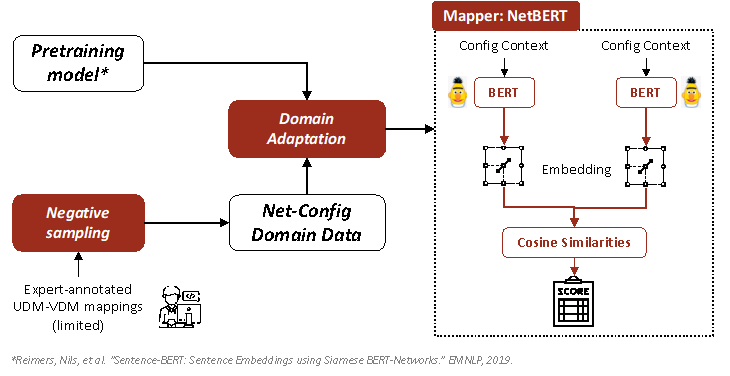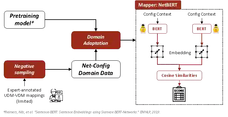 NAssim 映射器的核心是通过对预训练模型 SBERT 进行网络配置领域适应后得到的配置语义理解 AI 模型 NetBERT