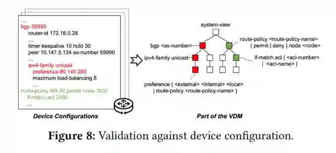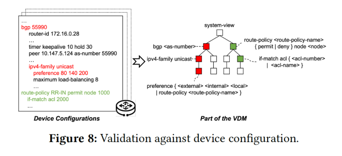 。相比于配置手册中的信息,现网配置文件具有正确性保障。如下图 8 所示,对于每个配置文件中的每行配置实例和其上层配置命令,检查它们是否能在给予配置手册构建的设备配置模型中找到对应的配置模版,并构成正确层级关系。