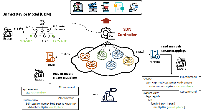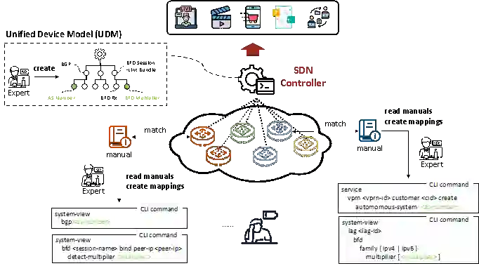 然而长期以来,不同供应商的网络设备缺乏统一的配置管理接口。当前的网络配置管理实践十分依赖运维工程师的人力付出,他们需要翻阅多个设备商的大量配置手册,理解各设备商的配置模型,编写规则将设备原生配置命令映射到中心控制器的统一配置模型,该过程非常繁琐且容易出错。