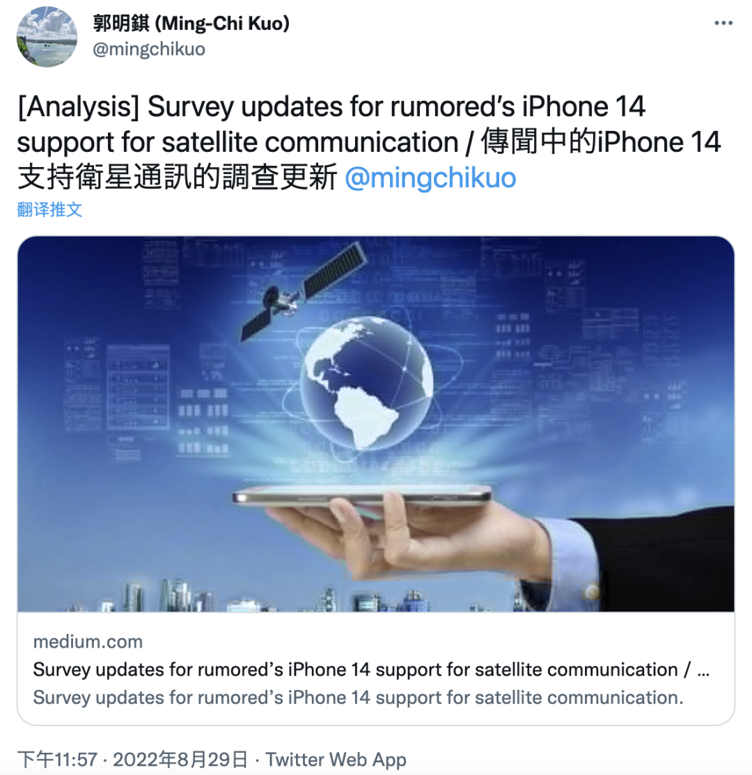 针对这一点,郭明錤表示,苹果“提供卫星通信服务的能力取决于苹果和运营商能否解决商业模式”。换句话说,苹果必须与一家卫星公司达成协议以支持该功能,但在 iPhone 14 上使用该功能不存在一些技术限制。