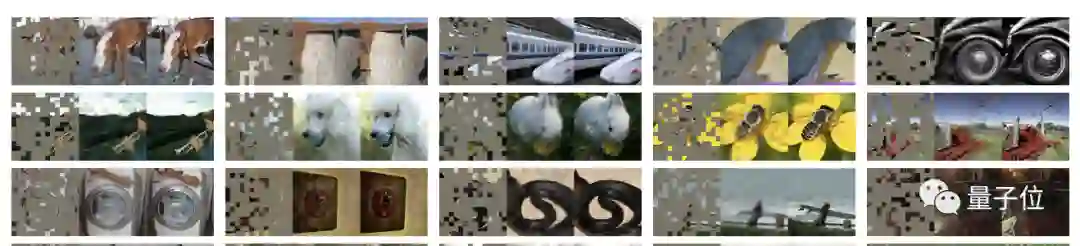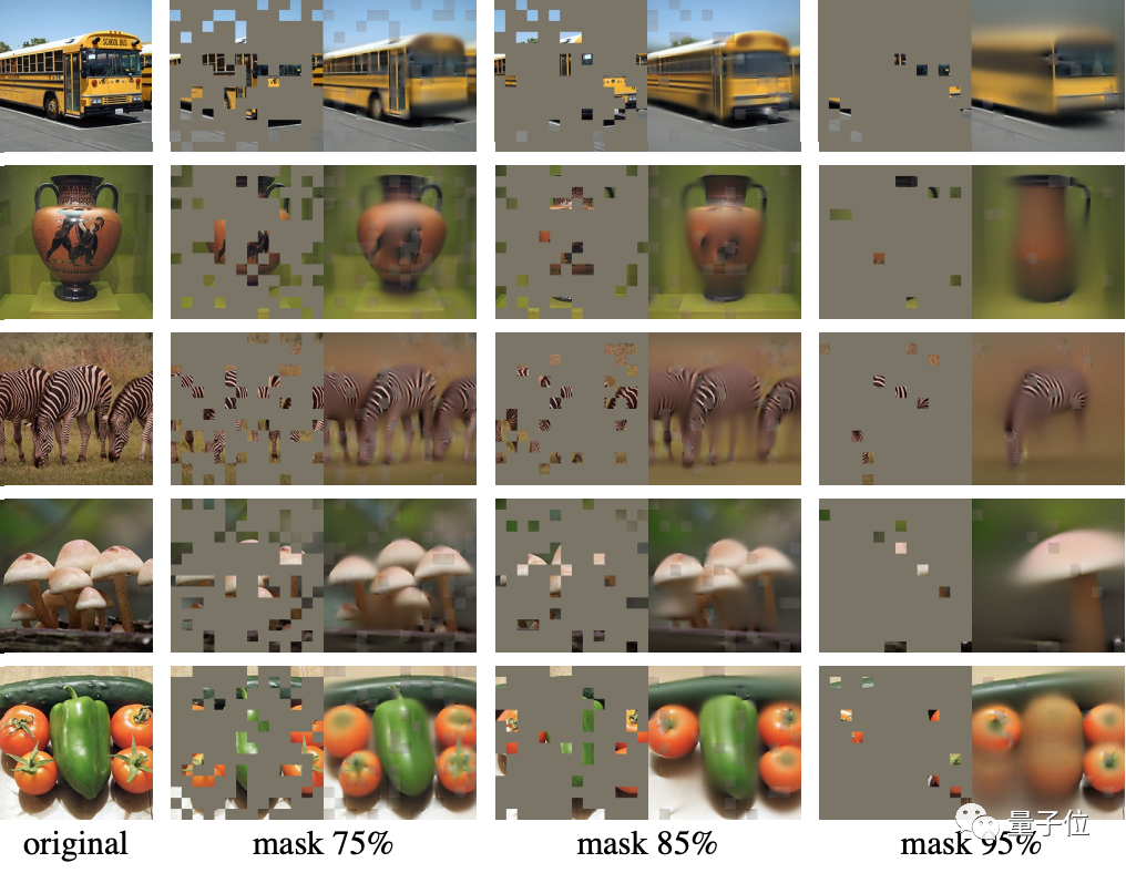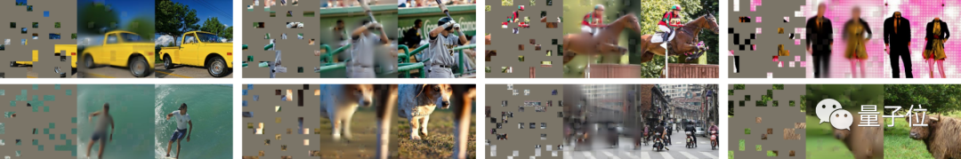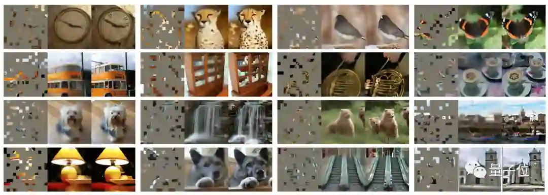 其中最左列为输入图像,中间列为MAE方法重建效果,最右侧为原图效果。