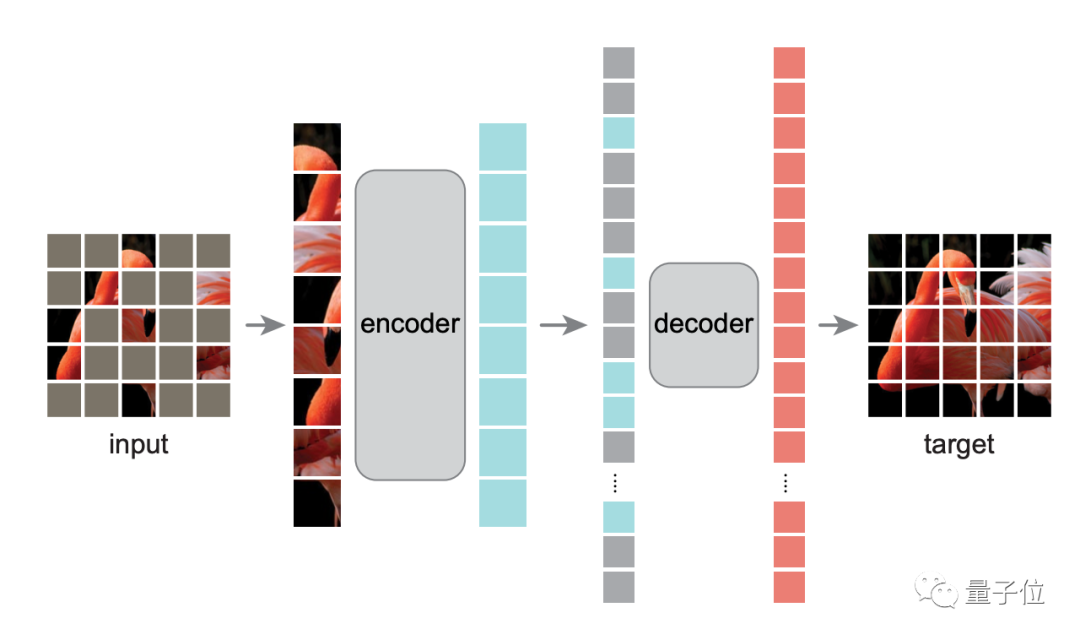 如图所示,编码器是ViT,它仅对可见区块进行操作,然后用一个轻量级编码器——仅在预训练期间负责图像重建任务。