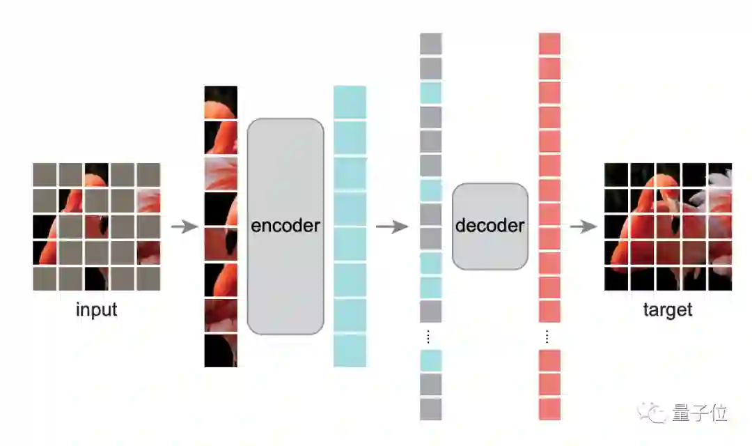 以遮蔽比例75%为例,它先在输入图像中掩蔽75%的随机区块,编码器只在可见的25%区块子集上运行,这样就可以只用非常少的计算和显存,来训练非常大的编码器。