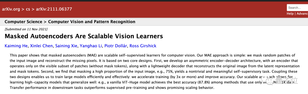 本文提出了一种用于计算机视觉的Masked AutoEncoders 掩蔽自编码器,简称MAE。