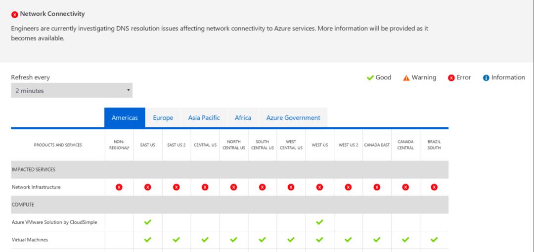 本文发稿时,这个云巨头在逐渐恢复如初,Azure地区在逐个地恢复正常,不过你遇到的实际情况可能会有所不同。问题似乎是从协调世界时(UTC)19点45分左右开始的。