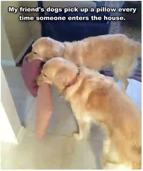 “我朋友家的狗,每次有人去ta家,就要叼着枕头出来欢迎……”