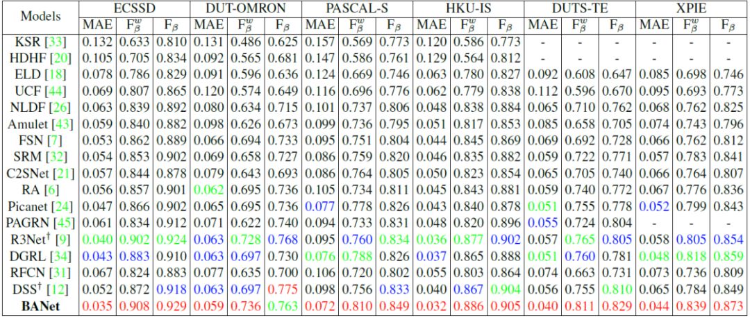 ▲ Fig 4. BANet与目前16种state-of-arts的方法在6种数据集上的对比