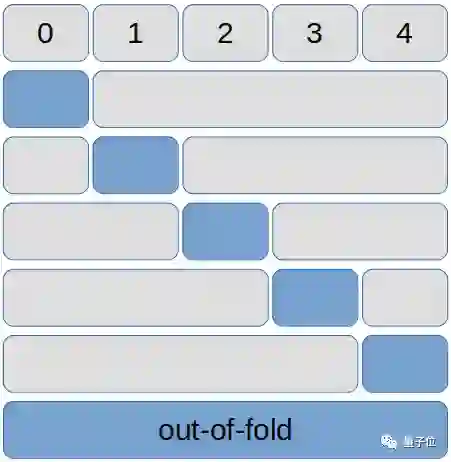 因为这些验证结果都是从没有在它们上面训练过的模型预测出来的,我们把这个五个验证折拼在一起的结果称为out-of-fold,包含整个训练集的验证结果(对应下图中的蓝色长块)。