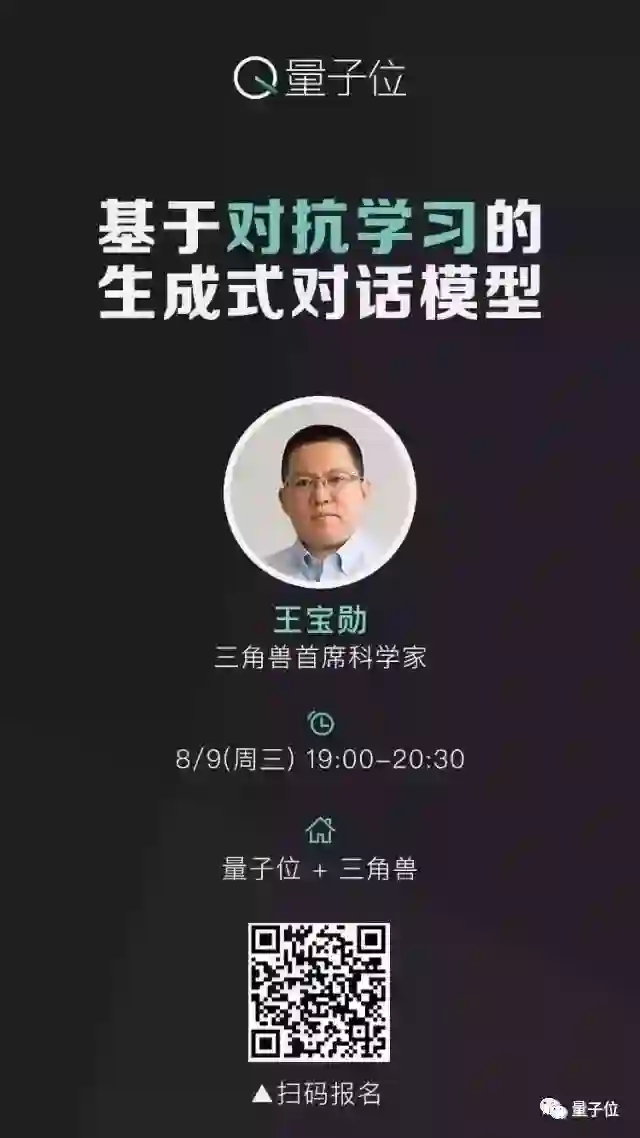 8月9日(周三)晚,量子位邀请三角兽首席科学家王宝勋,分享基于对抗学习的生成式对话模型,欢迎扫码报名 ▼