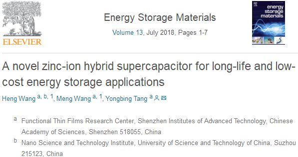 近日,中国科学院深圳先进技术研究院功能薄膜材料研究中心研究员唐永炳团队成功研发出一种新型锌离子混合超级电容器,该工作对研究基于多价载流子的新型储能器件具有重要借鉴意义。相关研究成果以A Novel Zinc-Ion Hybrid Supercapacitor for Long-Life and Low-Cost Energy Storage Applications为题,发表在储能材料领域期刊Energy Storage Materials上。