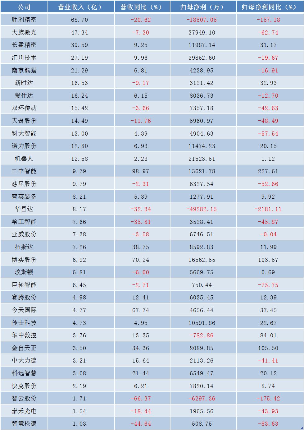 从归母净利看,近一半的公司净利下滑,汇川技术、大族激光、机器人、博实股份、三丰智能、长盈精密、诺力股份、佳士科技8家企业归母净利均在亿元以上,在这8家公司中,汇川技术、大族激光净利分别为3.99亿元、3.79亿元,分别下滑20%、62%;