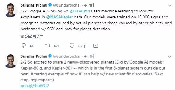 NASA 的科学家使用 Google 机器学习来对开普勒数据进行分析,其效率和准确性远超传统的分析方法。NASA 认为 Google 的 AI 技术将有助于在太阳系外探测到外星生命的迹象。