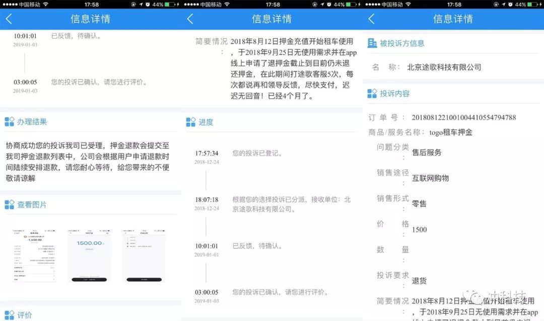此前,大量用户因押金无法正常退还,对北京途歌科技有限公司进行了投诉。一位用户表示,此前曾拨打12315消费者投诉热线进行投诉,12315进行调解后表示已进入退款流程,并会直接让途歌联系用户。该用户还说,他迟迟没有接到途歌的调解电话,退押金的事情也一直没有得到解决。