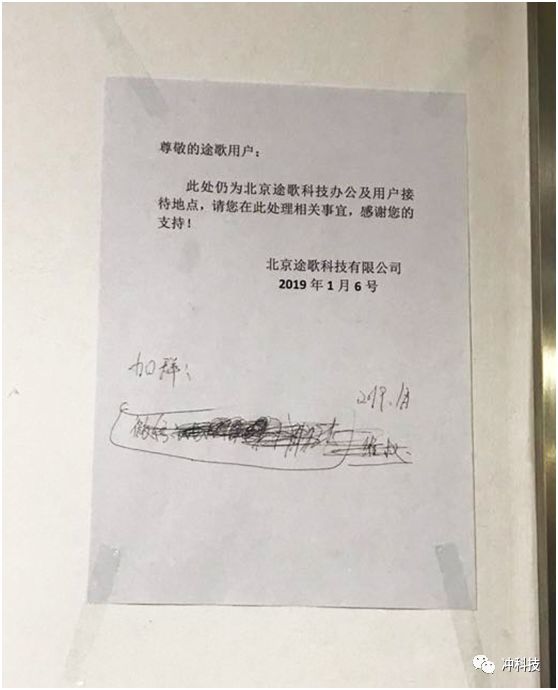 有途歌用户向冲科技反映称,位于嘉泰国际大厦的途歌原办公室已经停止办公,没有看到任何途歌员工的身影。1月21日,冲科技再次实地探访途歌办公地,此时的途歌办公室大门紧闭,并已用铁锁锁上,办公室内空无一物。同时,办公室门口并未张贴任何告示,告知新的办公地或任何搬家信息等。