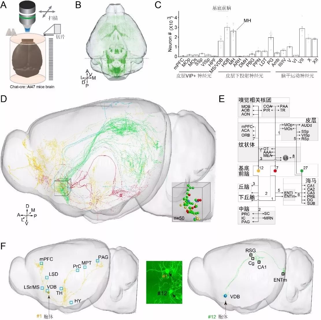 ► 乙酰胆碱能神经元全脑图谱 (A)切片成像示意图。(B)全脑三维分布。(C)乙酰胆碱能神经元主要分布的21个脑区内定量计数。(D)50个基底前脑乙酰胆碱能神经元的完整形态。(E)基于神经元投射连接对胆碱能神经元的分类结果。(F)相邻胆碱能神经元具有不同的投射模式。