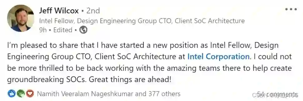 1月 6 号,威尔科克斯在 LinkedIn 上宣布他即将重返英特尔:“我非常激动能够回到那里,与了不起的团队一起工作,帮助创造突破性的 SOC 。伟大的事情就在前方!”这实际上标志着威尔科克斯重返英特尔,因为他从2010年到2013年就在该公司担任个人电脑芯片组的首席工程师。