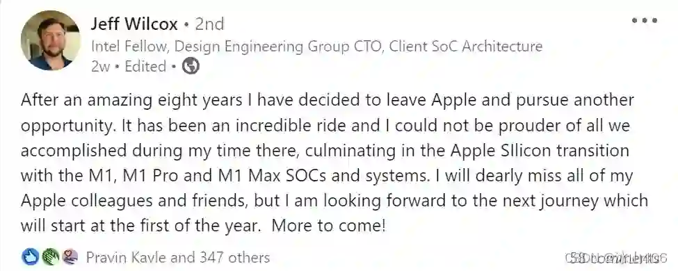威尔科克斯在 LinkedIn 上先后发表了两张帖子,先是去年12月宣布自己离职了,后在昨天透露了他已转投英特尔的消息。实际上这并不是威尔科克斯第一次加入英特尔,他在 2013 年加入苹果之前就在英特尔任职。在本月离开之前,威尔科克斯已经在苹果的 Mac 系统架构团队工作了八年多。