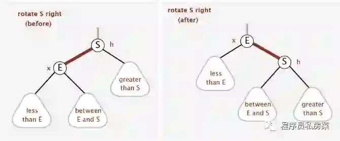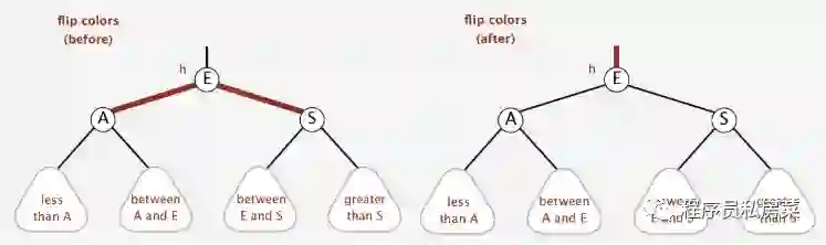 改变节点颜色比较容易理解,因为它违背了规则3。假设现在有个节点E,然后插入节点A和节点S,节点A在左子节点,S在右子节点,目前是平衡的。如果此时再插一个节点,那么就出现了不平衡了,因为红色节点的子节点必须为黑色,但是新插的节点是红色的。所以这时候就必须改变节点颜色了。所以我们将根的两个子节点从红色变为黑色(至于为什么都要变,下面插入的时候会详细介绍),将父节点会从黑色变成红色。可以用如下示意图表示一下: