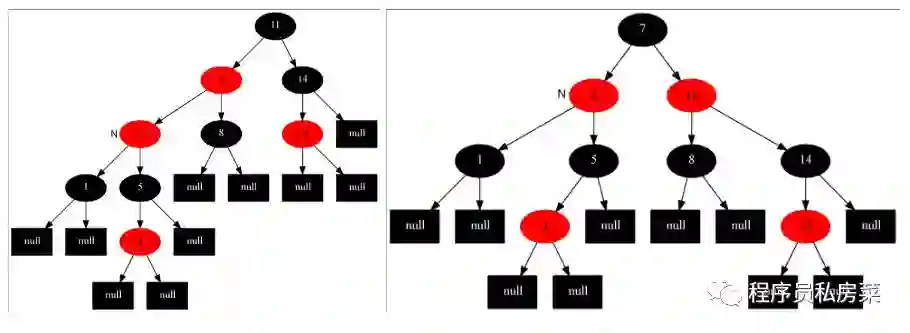 于情况3:插入节点的父节点是红色,叔叔节点是黑色,且插入节点是其父节点的左子节点。我们要做的操作有:将当前节点的父节点(7)涂黑,将祖父节点(11)涂红,在祖父节点为支点做右旋操作。最后把根节点涂黑,整个红-黑树重新恢复了平衡,如右上图所示。至此,插入操作完成!