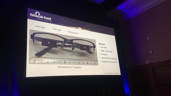 腾讯在黑帽安全大会上展示的特制眼镜,上面贴有黑白胶带。