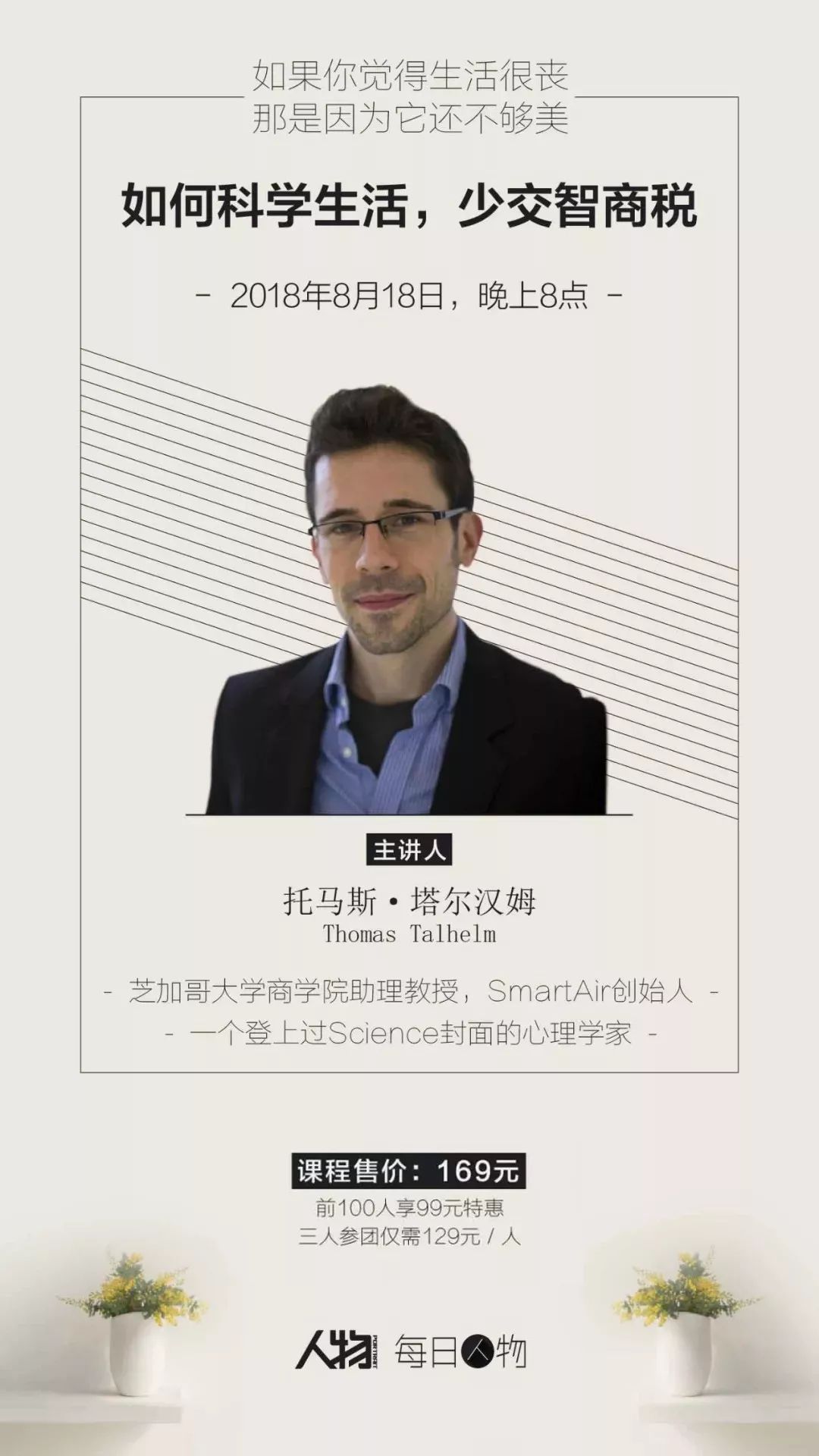 托马斯·塔尔汉姆,芝加哥大学商学院助理教授,SmartAir创始人,两次登上过世界顶级学术杂志《科学》(《Science》)的心理学家,其中一次还是封面报道。