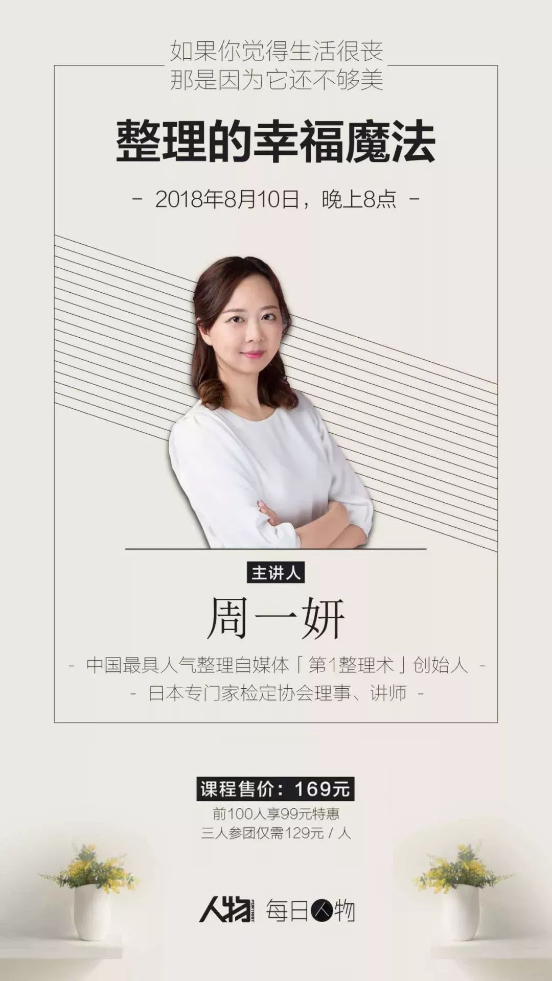 2013年开始学习日式整理术,经过系统培训和学习,2017年,周一妍成为日本专门家检定协会1级(最高级)整理收纳达人。现在全中国,有20多万整理爱好者跟着她一起学习真正专业的「断舍离」和空间收纳术。