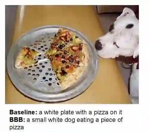 作者在论文中给出了他们新方法在图说生成在 MSCOCO 上与此前方法的对比。可以看出,BBB 相较以前的结果有显著提升。