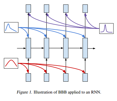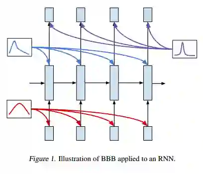 论文的其余部分组织如下。第 2 节和第 3 节分别回顾了通过反向传播做贝叶斯(Bayes by Backprop,BBB)和通过时间做反向传播(Backprop through time)。第 4 节推导出了用于 RNN 的 Bayes by Backprop,而第 5 节描述了后验的锐化。第 6 节简要回顾了相关工作。第 7 节做了实验评估,最后在第 8 节进行讨论并得出结论。